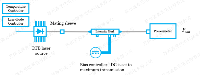 调制器的损耗是由于光纤和波导耦合,光在波导的传输过程等造成的光强衰减。对于强度调制器,需要通过调节调制器的DC偏压(Pin 1&2),以测量调制器的最大传输(输出)功率。对于相位调制器,则无需偏压控制,直接测量输入和输出功率。需要注意的是有和无光学接头(通常为FC/APC)的调制器测量方法的区别,常规产品都是带光纤接头的,所以这里我们仅仅介绍这种测量方法。无光纤接头的测量方法,请CA888亚洲城提供详细的调制器手册。 将电光调制器输入功率和输出功率之差定义为插损: