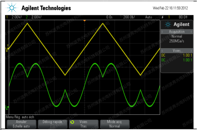 下图中黄色的曲线是锯齿波射频的电信号(10Vpp)作用于电光强度调制器MX-LN-10调制器射频接口上。绿色曲线是强度调整器输出的光强,通过测量p相移所需的电压,VpRF=4.8V@1540nm。使用不同频率的射频电信号,我们可以测得对应频率下的VpRF。但是这种测量方法,并且随着频率的升高,所需的高频设备也会变得非常昂贵。