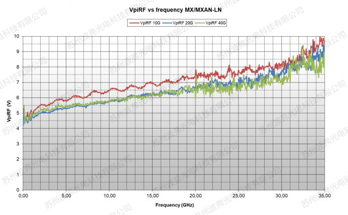 这是因为尽管与材料无关,但是设计和生产方面,任何射频电子零部件,随着频率的升高都会有射频的衰减,其功率从最高点下降到1/2的位置对应的频率,我们称为-3dB带宽(请参考微信文章“iXblue电光调制器常见参数定义”)。虽然材料本身的参数并不随频率升高而变化,但是波导的电极等射频部分不可避免的存在高频衰减,因此调制器的射频半波电压Vp RF随着频率的升高而升高。