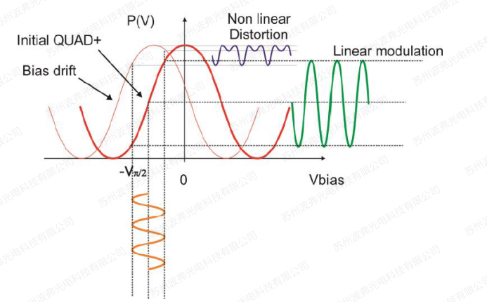 铌酸锂(LiNbO3)强度调制器由于具有较宽的带宽,抑制啁啾特性,长期可靠等特性,是高速光传输系统不可缺少的器件。然而,作为铌酸锂调制器输出的工作点随温度和时间漂移而略有变化,该漂移会导致消光比的变差,波形的畸变等,如下图。