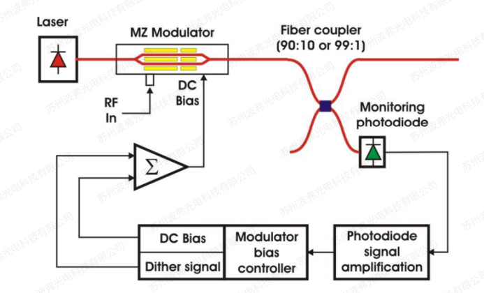 为了调节并保持调制器输出状态,监控并补偿直流偏压的变化,我们需要从输出的光信号中采样一小部分(通常1%或10%),把它接入监控光电二极管(PD),再通过偏压控制器的反馈电路进行控制。在这方面,通常有两种方法可以获得来自铌酸锂波导调制器的监控光信号。第一种方法在调制器输出端口外接一个耦合器,以及提取一部分调制信号作为监视信号,尽管最终输出的使用功率根据耦合器的性能略有损失。另一个方法是在调制器内部集成一个PD,用于测量波导和耦合处的杂散光,这样的好处是不引起主输出信号的任何额外损耗。