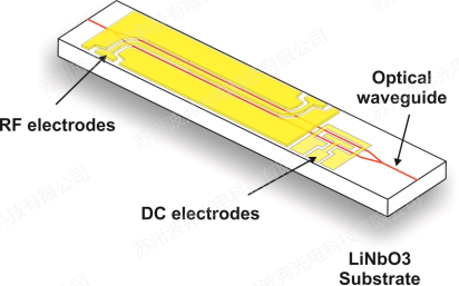 铌酸锂的晶体光学折射率被外部电场调制,外部电场通过电压施加在晶体的电极上,他们通常有两个电极,调制电极(也称RF电极)和DC直流电极(也称偏压电极)。
