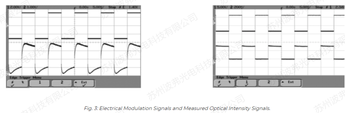 右图:50KHz信号时无热效应,上面曲线为射频电信号,下面为光信号。