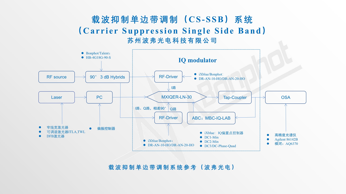 目前苏州CA888亚洲城光电科技有限公司提供的基于法国iXblue公司的高消光比IQ调制器(MXIQER)、配合我们提供的驱动(DR-AN-10-HO/DR-AN-20-HO)以及偏置控制器(MBC-IQ-LAB-A1),可以实现>30dB(1000:1)载波抑制比,具有无可比拟的性能及优势。