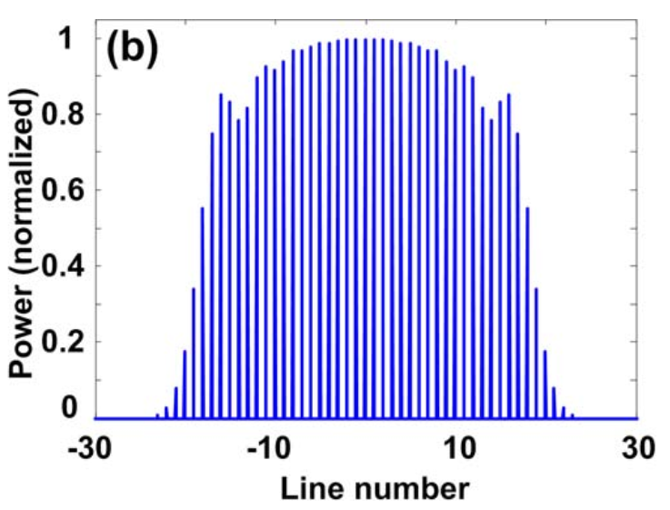 光学频率梳(Optical Frequency Comb)是由一系列离散、等间距的规则光脉冲序列组成,能够在一个频段内同时提供几个至上百个个不同的频率成分。具有梳线数目多、频率范围广等优势,且具有固定的频率间隔等,能够代替多个激光器,是理想的多载波光源。