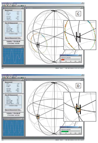 对于这些准直器,结果偏振经过调整,旋转对应于庞加莱球上的 8 字形。 当到达两极时设置圆偏振光,右旋圆偏振位于北极,左旋偏振位于南极。 如果光学器件的实际延迟偏离所需值,则极值不会到达两极。 因此,偏振分析仪提供了光学器件实际延迟的测量值。