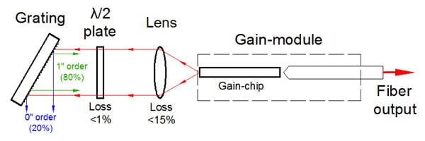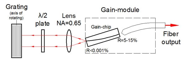 该设备包括带有弯曲条纹的“C型”增益芯片。条纹倾斜的刻面专为外部反馈而设计,并具有深层 AR 涂层,从而使芯片波导的背反射极低。它确保了自激的阻断,并消除了在外腔系统中操作时与复合腔相关的问题。这导致在整个调谐范围内具有高边模抑制比 (SMSR) 的非常精细的谱线。具有垂直条纹的刻面具有适当的反射率(通常在 5-15% 的范围内),以同时提供宽波长调谐和高输出功率。标准器件中这一方面的反射针对在外腔设置中的操作进行了优化,该设置为芯片提供了有效的反馈(约 50%)(如图所示)。对于反馈较低的方案,我们建议使用在刻面上具有不同涂层的定制设备,以提供优化的反射。
