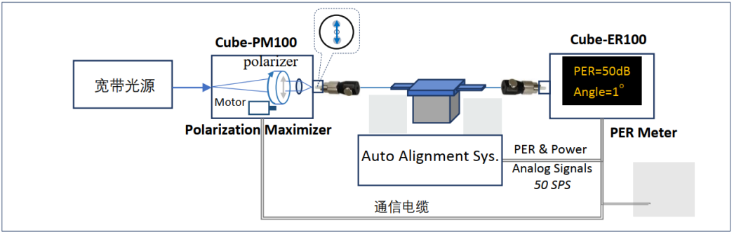 在测量保偏器件的偏振消光比(PER)时 ,较低的光源线偏振度 ,以及线偏振光与保偏光纤光轴之间的对轴角度偏差是PER测量误差的主要来源。为了最大限度的消除这两种测量误差源, 本公司自豪地推出了业界首个自动化偏振消光比测量系统。